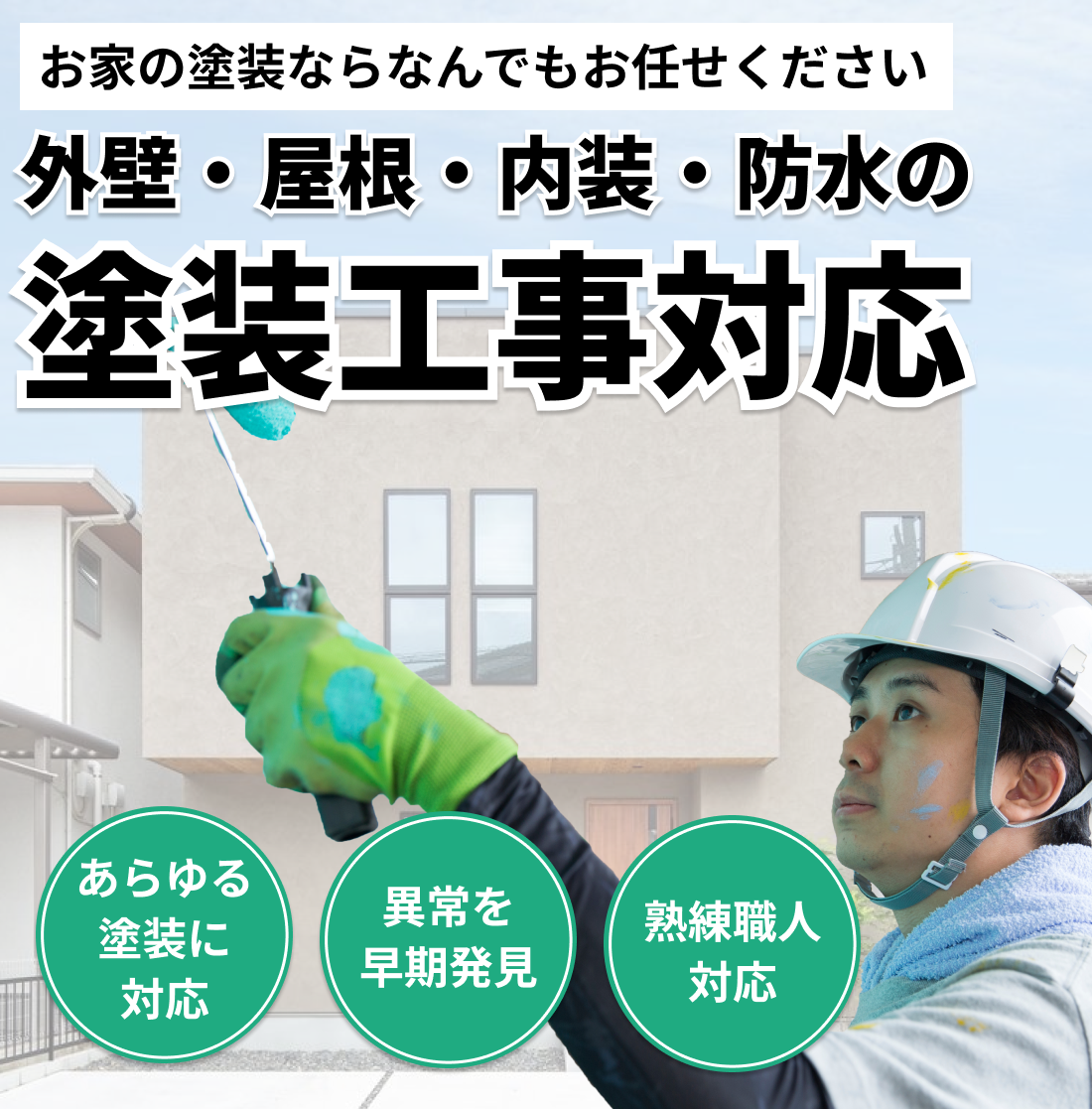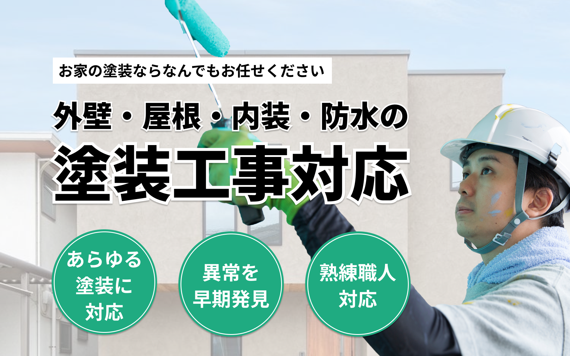 外壁塗装、屋根塗装、内装塗装、防水塗装。塗装のことならなんでもお任せ下さい。塗装工事は建物の美観と建物の構造を守る2つの大きな役割があります。