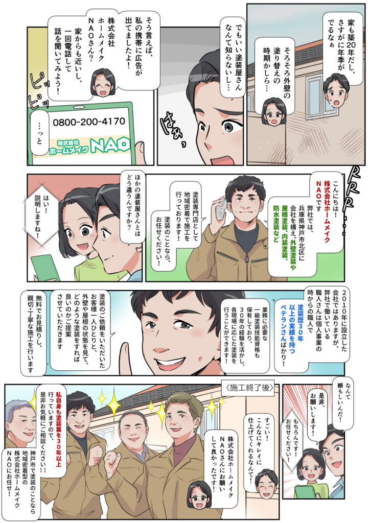 神戸市でお住まいの塗装工事をするなら、地域密着の営業により高リピート率を実現している信頼と実績の株式会社ホームメイクNAOにお任せください。